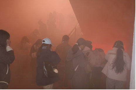 演练模拟真实火灾场景。随着警报响起,全体师生迅速响应,按照预定疏散路线,采取低姿、捂口鼻等防护姿态,有序撤离至指定安全区域。整个过程组织严密、响应及时、秩序井然,展现出我院师生良好的应急反应意识和协同配合能力。